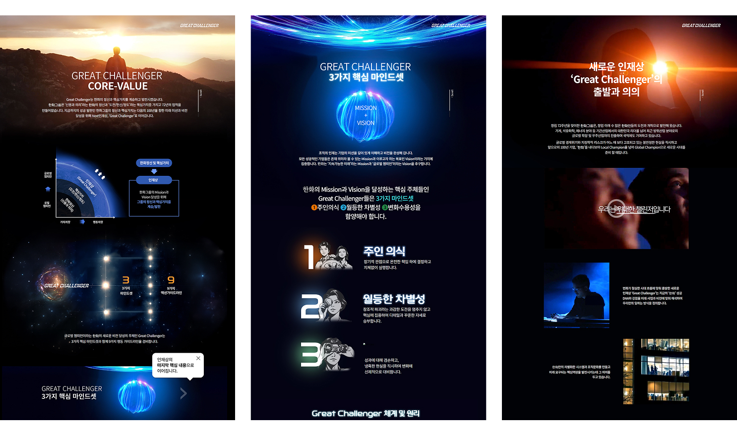 한화의 도전적인 문화를 조직문화 속에서 살아 움직이는 행동 원칙으로 구체화한 사내캠페인입니다. 도전은 개인의 성취가 아닌 함께 성장하는 문화의 동력이라는 인식 아래 임직원이 스스로의 도전 방식을 정의하고 공유할 수 있는 경험을 설계하였습니다.