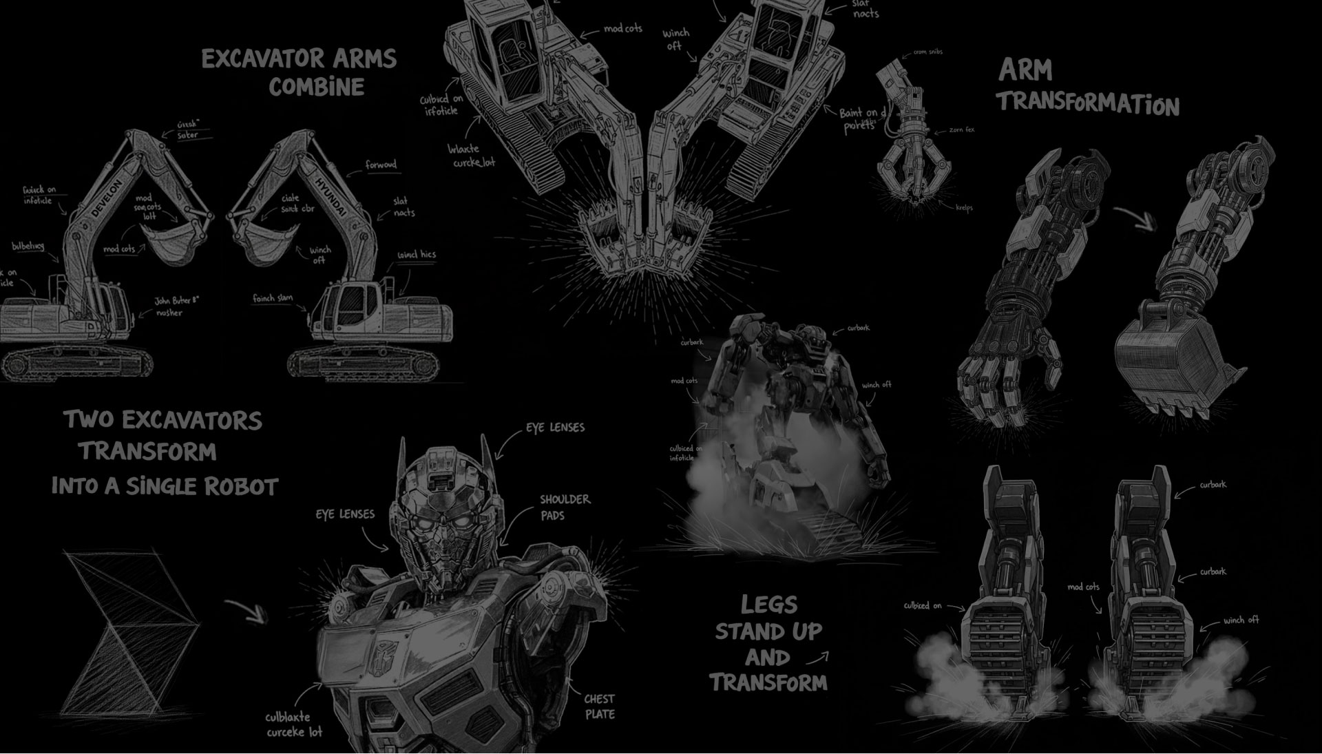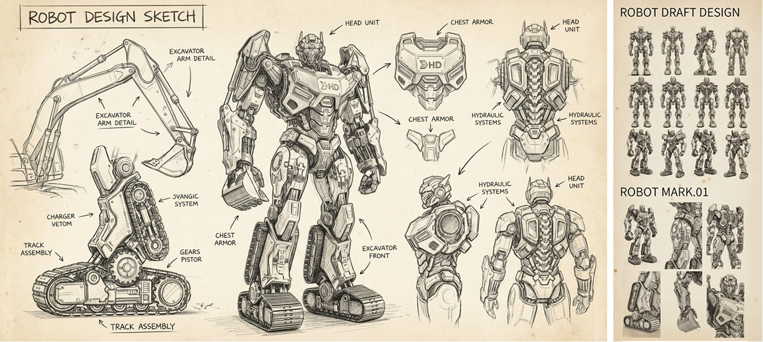 굴착기의 고유한 구조적 특징과 실루엣이 로봇 디자인 전반에 일관되게 반영되도록 설계했습니다.